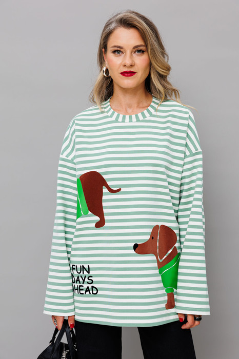 Лонг оверсайз прямого кроя. По переду выполнен дизайнерский принт в виде"собачки". Ткань полосатая двухнитка. Длина - 70 см