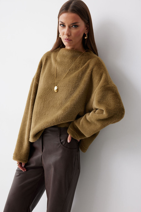 Джемпер прямого силуэта из трикотажного полотна с фигурным низом. Горловина цельнокроеная стойка. Рукав со спущенной линией плеча, удлиненный. Джемпер со смещенным боковым швом.