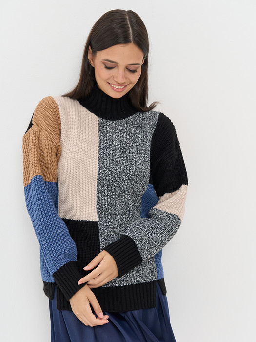 Совместные покупки Пермь Женская одежда Джемперы, свитеры, водолазки — Джемпер NewVay 7242-40254 чёрный/джинс/чёрный-молоко/ ваниль/ристретто