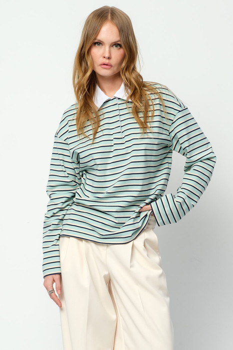 Свободный трикотажный джемпер в полоску с контрастным воротником-поло.