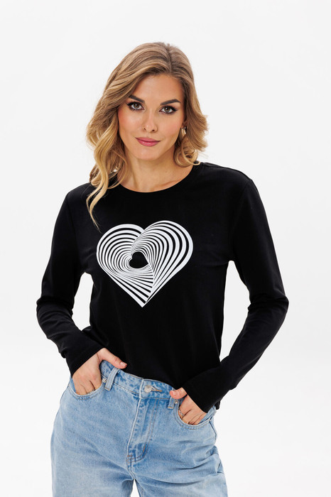 Лонгслив женский полуприлегающего силуэта из трикотажной ткани. По переду расположен принт. Рукав втачной, одношовный. Вырез горловины круглый.