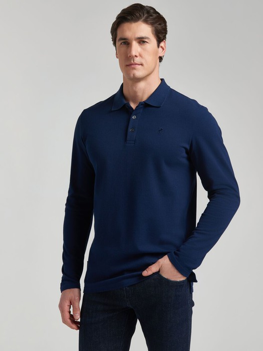 Футболка-поло из хлопкового полотна "пике". Модель поло лонгслив с длинными рукавами. Воротник выполнен из трикотажной рибаны темно-синего цвета. На полочке застежка-планка на пуговицах. На полочке вышивка "R". По низу футболки в боковых швах выполнены резрезы, обработанные тесьмой. В боковом шве распложен жаккардовый флажок "Red N Rocks"