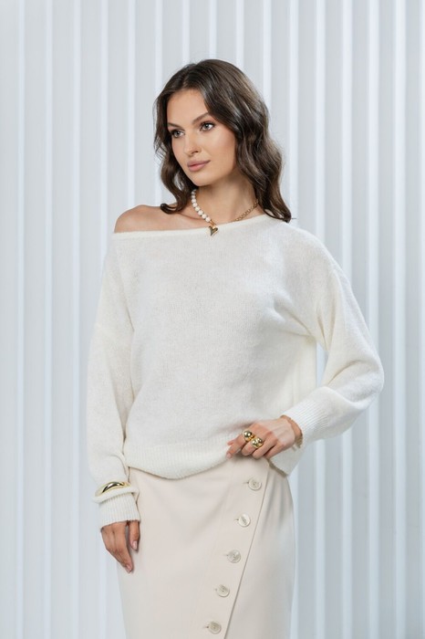 Джемпер прямого силуэта с заниженной линией плеча.  Рукав рубашечный длинный. Джемпер очень мягкий и приятный к телу, вывязан переплетением кулирная гладь.Низ изделия и низ рукава  связаны переплетением ластик 1*1. Вырез горловины в виде "лодочки".