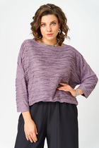 Джемпер женский из трикотажной хлопковой ткани (двунитка). Рукав реглан. Низ рукава обработан притачной манжетой. Низ изделия оформлен притачным поясом. На спинке настрочен декоративный элемент. Вырез горловины круглый, обработан бейкой со шнуром.