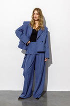 Джемпер женский из трикотажной ткани, полуприлегающего силуэта. По переду джемпера расположены декоративные элементы.  Вырез горловины круглый, оформлен бейкой. Пройма рукава оформлена воланами.
