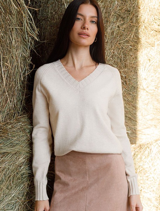 Состав: 52%ПАН (акрил) 33%ПЭ 8%ПУ 7%Кашемир Размер товара на первом фото: 42Невероятно женственный джемпер овсяного цвета с V вырезом связан из высококачественной пряжи с кашемиром — идеальное сочетание мягкости и практичности. Пряжа с кашемиром придаёт ему бархатистую нежность и тонкую структуру, каждое прикосновение с которой, напоминает о тепле и уюте в прохладные дни. Благодаря нежной текстуре материала этот вариант отлично подходит даже для чувствительной кожи, не вызывая раздражения и дискомфорта в течение дня. Сдержанный, элегантный силуэт джемпера подчёркивает вкуc обладательницы, а филигранная отделка ворота — внимание к деталям. Универсальный оттенок и изящная мягкость делают его идеальным выбором в любой ситуации. Широкие манжеты и нижний край добавляют аккуратности, а продуманная посадка делает повседневный джемпер удобным для многослойных образов — от офисного комплекта, например, в сочетании с блузкой, до расслабленного уикенда. Свободный крой джемпера идеально подходит для женщин, которые ценят удобство и стиль одновременно, а так же идеально подходит на большие размеры. Благодаря качественной пряже свитер сохраняет форму и внешний вид даже после многократных носок. Практичный фасон идеально подходит для работы в офисе или встреч с друзьями. Благодаря классическому крою джемпер гармонично сочетается практически с любыми элементами гардероба, помогая всегда выглядеть актуально. Сочетается в костюме с брюками D38.013, D38.012 и юбкой D36.016