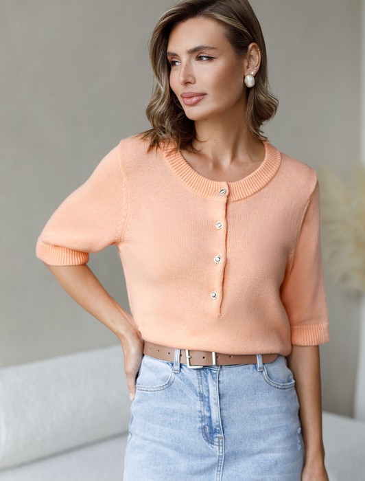 Состав: 70%Хлопок 21%ПА 9%Кашемир Плотность: 12 GG Размер товара на первом фото: 42Джемпер тонкой вязки выполнен из хлопка с добавлением кашемира. Модель с круглым вырезом дополнена золотистыми пуговицами. Мягкая и очень приятная пряжа совершенно не колется, сохраняет тепло при этом не перегревая, гарантируя безупречный комфорт.