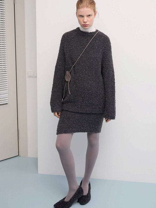 Удлинённый силуэт позволяет носить джемпер как самостоятельную вещь или собирать его в комплект с брюками и юбками букле из альпаки и шерсти Aim Clo. Форма остаётся спокойной и сбалансированной, оставляя фактуре ведущую роль в образе.