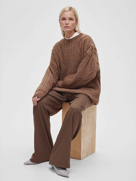 Джемпер удлиненного кроя из шерсти с фактурным плетением косами и круглым вырезом.