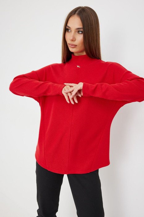 Джемпер свободного силуэта со спущенной на руку проймой. По горловине притачная стойка. По бокам джемпера фигурные подрезы.