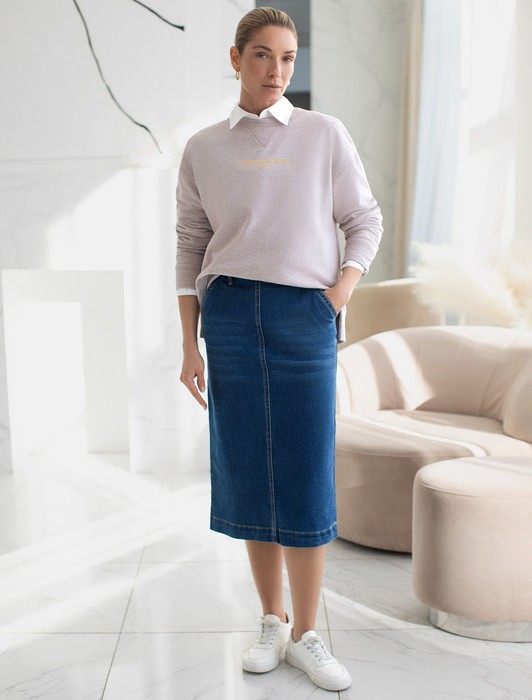 Высокая посадка , фасон карандаш и декоративный прямой шов спереди, визуально удлиняют ноги, вытягивают силуэт. Застежка на молнию обеспечивает удобство надевания и надежную фиксацию. У джинсовой юбки предусмотрены два аккуратных боковых кармана и один задний карман – маленькие детали, которые добавляют практичности без лишнего объема. Премиальная фурнитура гарантирует долговечность. На поясе брендированный патч из эко-кожи. Эластичная ткань адаптируется под любую фигуру, подходит на маленькие и большие размеры.