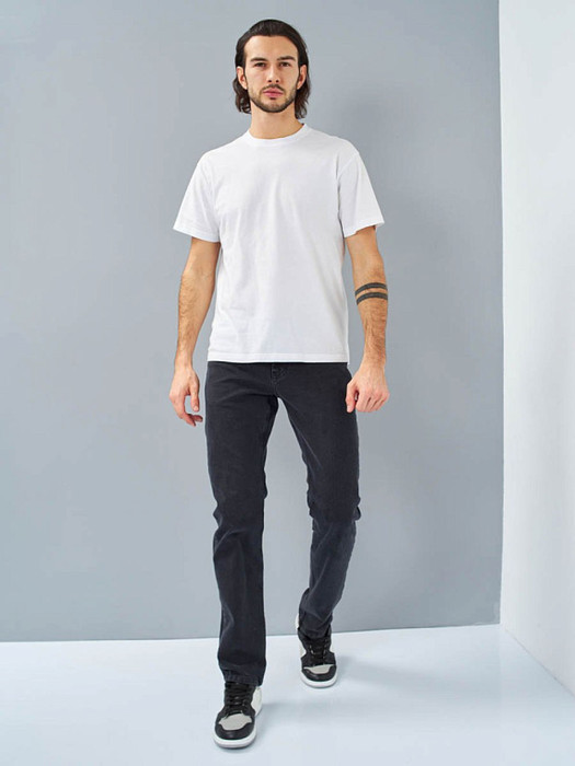 Мужские модные джинсы с пятью карманами. Посадка Regular fit (полуоблегающие по бедру), конструкция бокового шва прямая - Straight cut. Низкая высота талии спереди и высокая сзади. Застежка на молнии. Зауженные к низу. Выполнены из слабоэластичной ткани denim comfort stretch, цвет ткани Black/Black (лицевая и изнаночная стороны ткани черные). Классическая темная стирка с потёртостями только по швам. Параметры указаны для размера 32. Длина внутреннего шва  - 83,5 см.