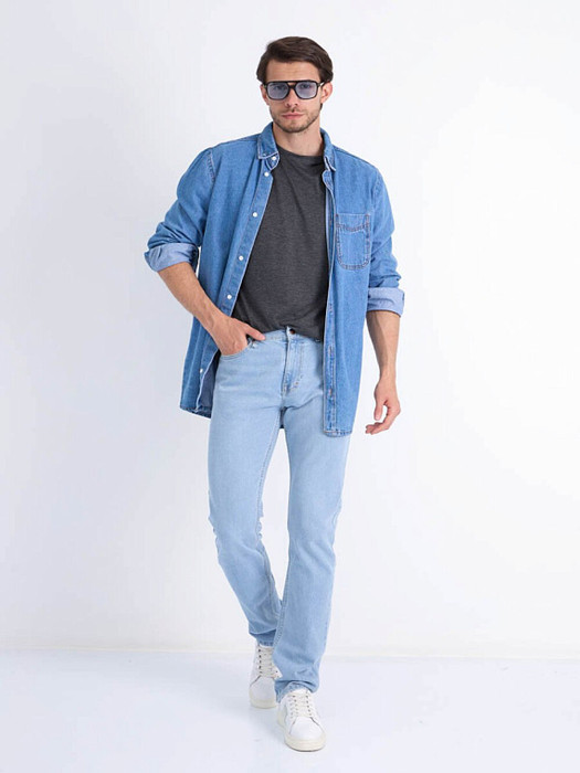 Мужские классические джинсы с пятью карманами. Посадка Slim fit (облегающие по бедру), средняя высота талии. Застежка на молнии. Немного зауженные к низу. Выполнены из слабоэластичной ткани denim comfort stretch. Классическая светлая стирка "stone wash"с отбеливанием.