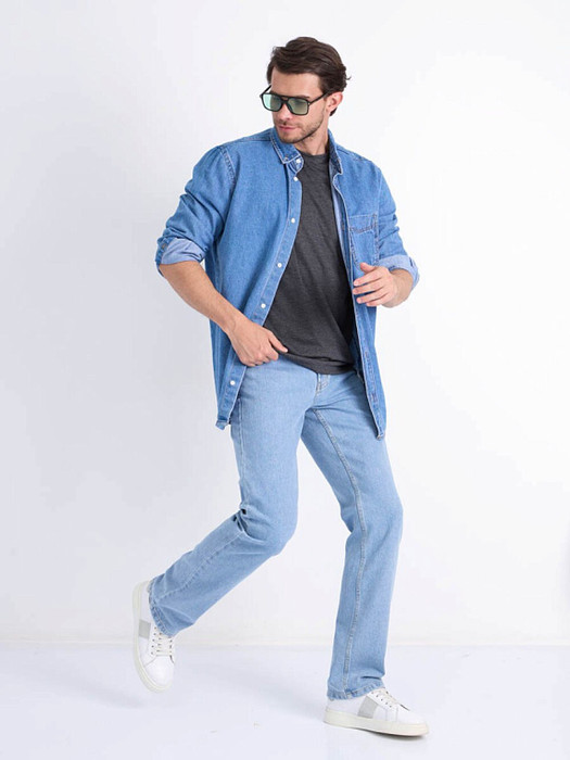 Мужские классические джинсы с пятью карманами. Посадка Regular fit (полуоблегающие по бедру), высокая талия, немного заужены к низу. Застежка на молнии. Выполнены из слабоэластичной ткани denim comfort stretch.. Светлая стирка стирка "stone wash".