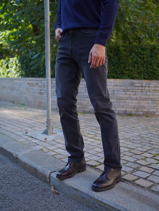 Мужские модные джинсы с пятью карманами. Посадка Slim fit (облегающие по бедру), средняя талия спереди, высокая сзади.. Застежка на молнии. Немного зауженные к низу. Боковой шов сделан в разутюжку . Выполнены из слабоэластичной ткани denim comfort stretch, цвет ткани Black/Black (лицевая и изнаночная стороны ткани черные). Средняя стирка с потёртостями и "усами" спереди и потёртостями сзади. Основной оттенок ткани после стирки темно-серый.