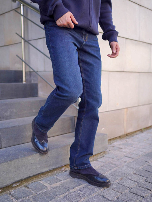 Мужские классические джинсы с пятью карманами. Посадка Regular fit (полуоблегающие по бедру), высокая талия, немного заужены к низу. Застежка на молнии. Выполнены из слабоэластичной ткани denim comfort stretch. Боковой  шов   сделан "в разутюжку", к нижней части шва  пришита  специальная декоративная тесьма  "selvadge", имитирующая контрастную кромку джинсовой ткани. Темная стирка со слабовыраженными потёртостями и "усами" спереди и потёртостями сзади.Джинсы дополнительно чуть-чуть подкрашены в желтый цвет для получения эффекта "GET DIRTY", т.е. эффекта запачканных джинсов.