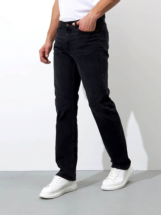 Мужские классические джинсы с пятью карманами. Посадка Regular fit (полуоблегающие по бедру), средняя высота талии. Застежка на молнии. Немного зауженные к низу. Выполнены из слабоэластичной ткани denim comfort stretch, цвет ткани  Black/Black (лицевая и изнаночная стороны ткани черные).  Темная стирка со слабовыраженными  потёртостями спереди и  сзади.