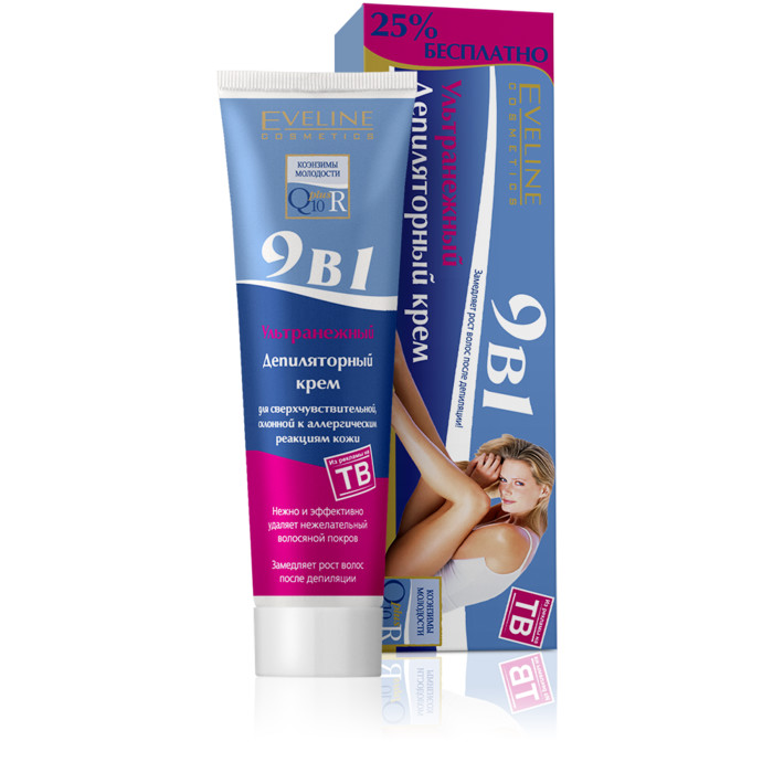Ультранежный депиляторный крем 9 в 1 подходит для удаления волос на сверхчувствительной и склонной к аллергическим реакциям коже. Нежно и эффективно удаляет нежелательный волосяной покров, максимально успокаивает кожу во время депиляции.