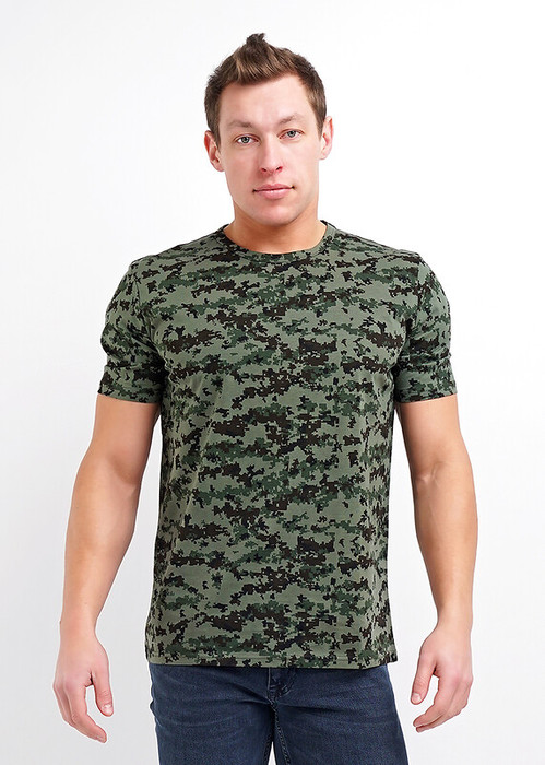 Фуфайка с коротким рукавом среднего объема в набивку «камуфляж», с круглым вырезом горловины, которая оформлена обтачкой из рибаны.
