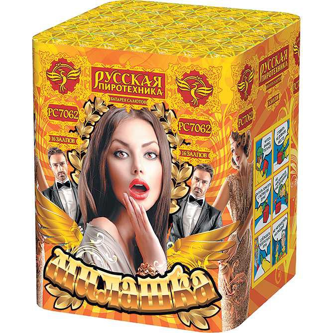 Фейерверк Милашка включает в себя 16 залпов вылетающих ракет, которые способны набирать высоту 35 метров. Огненное шоу продолжается 25 секунд! Все использованные здесь эффекты являются одними из самыми потрясающих! Разноцветные кометы разрываются яркими сферами из серебряных форсов, продолжающиеся зелеными и красными мерцающими огнями. За ними следуют золотые мерцающие форсы, дополненные голубыми и золотыми мерцающими огнями. Игра огня и света продолжается, а вместе с ней меняются цвета, яркость и формы салюта! В финале огненного шоу зрители увидят потрясающие оранжевые огни и множество золотых форсов с трещащими искрами, от которых замирает сердце!Эффекты:1. Разноцветные кометы разрываются сферами из: серебряных форсов, зеленых и красных мерцающих огней. 2. Золотых мерцающих форсов, голубых и золотых мерцающих огней. 3. Коротких искристых шуршащих форсов, синих и зеленых мерцающих огней. 4. Оранжевых огней и золотых форсов с трещащими искрами.