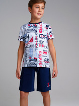 Футболка оверсайз для мальчика из трикотажного полотна: хлопкового с добавлением лайкры. Модель с принтом на переде, спущенной линией плеч, рукавами длиной до локтя.