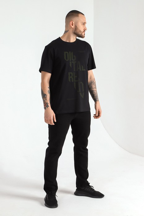 Футболка мужская из гладкокрашеного трикотажного полотна "кулирка" с лайкрой, классическогоь покроя, с коротким втачными рукавами, горловиной овальной формы, обработанной втачной планкой и принтом на полочке, выполненным в технике шелкографии.