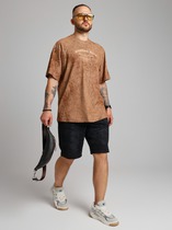 Футболка мужская из трикотажного полотна с набивным рисунком в узкую черно-белую полоску в комбинации с черным однотонным материалом. Модель с короткими рукавами покроя "реглан", горловиной овальной формы, обработанной втачной планкой, и принтом на детали переда.