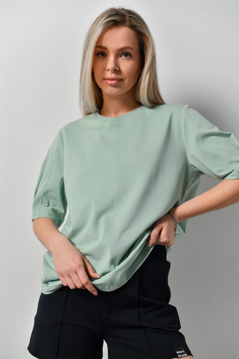 Футболка женская модной объемно-силуэтной формы, с вертикальным отстроченным швом по центру переда. На рукавах выполнены глубокие защипы по низу и также вертикальные отстроченные швы.
