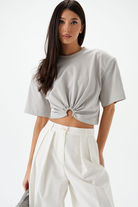 Футболка прямого кроя, выполнена из хлопкового полотна серого цвета. Характеристика: укороченая, прямой свободный крой, горловина овальная, рукав слегка спущен, подплечники, спереди декоративная сборка на элемент-полукольцо . Длина по центру спинки от края горловины 40 см, длина рукава от края горловины 39 см.