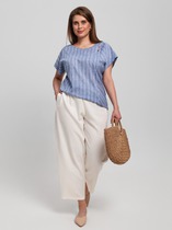 Футболка - женская из трикотажного полотна «кулирка» с набивным рисунком в полоску, с цельнокроеными рукавами, горловиной овальной формы, окантованной основным материалом. Деталь полочки состоит из двух частей, одна из которых с ассиметричным направлением рисунка. В плечевом шве заложена складка, дополненная декоративными пуговицами.