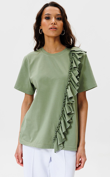 В этой футболке с воланом от GOwear вы не останетесь незамеченной! Вы легко сможете собрать много стильных образов с вашими юбками, шортами, жакетами и брюками!