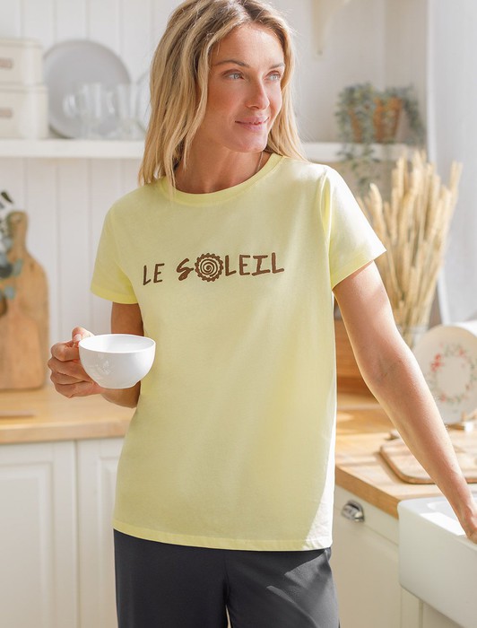 Состав: 100%Хлопок Плотность: 140 Г/м2Перевод принта: "le soleil (фр.) - солнце". Футболка прямого кроя выполнена из 100% хлопка. Базовая модель дополнена лаконичным авторским принтом. Легко впишется в повседневный гардероб. Изделие хорошо держит форму и обеспечивает комфортный микроклимат в течение дня.