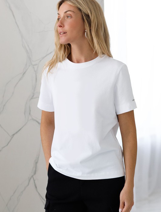 Состав: 92%Хлопок 8%ПУ Плотность: 170 Г/м2 Параметры модели на первом фото: Рост 170, бюст 83, талия 64, бедра 88Базовая однотонная футболка из премиального хлопка. Горловина выполнена из рибаны в тон изделия, Добавление эластана в состав изделия способствует формоустойчивости. Самое высокое качество хлопковых волокон обеспечивает комфорт в любое время года. Идеально держит форму и сохраняет внешний вид в течение долговременного использования. Универсальная базовая вещь для ваших стилистических решений. Изделие дополнено металлическим логотипом бренда на рукаве.