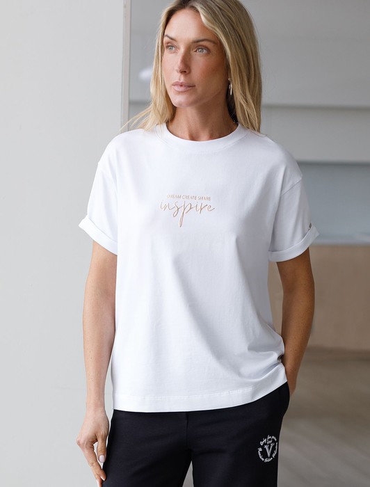 Состав: 92%Хлопок 8%ПУ Плотность: 170 Г/м2 Параметры модели на первом фото: Рост 170, бюст 83, талия 64, бедра 88Перевод принта: Dream, create, share, inspire — мечтай, создавай, делись, вдохновляй.