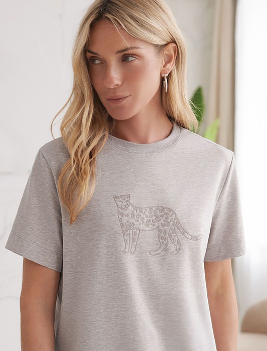 Состав: 92%Хлопок 8%ПУ Плотность: 170 Г/м2Футболка выполнена из премиального хлопка.Принт "леопард" нанесен фактурными красками с устойчивым покрытием. Наличие эластана в составе гарантирует комфорт и формоустойчивость. Изделие дополнено фирменным металлическим логотипом бренда.