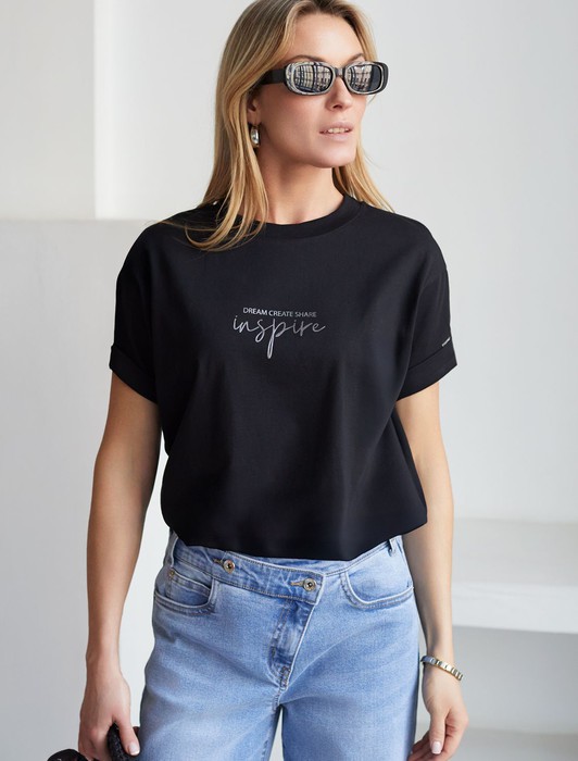 Футболка из премиального хлопка, высокое качество хлопковых волокон обеспечивает комфорт в любое время года. Горловина выполнена из рибаны в тон изделия, Рукава с подворотами и золотистым логотипом бренда. Авторский принт нанесен фактурными красками с устойчивым покрытием. За счет эластана в составе идеально держит форму и сохраняет внешний вид в течение долговременного использования. Универсальная вещь для ваших стилистических решений.