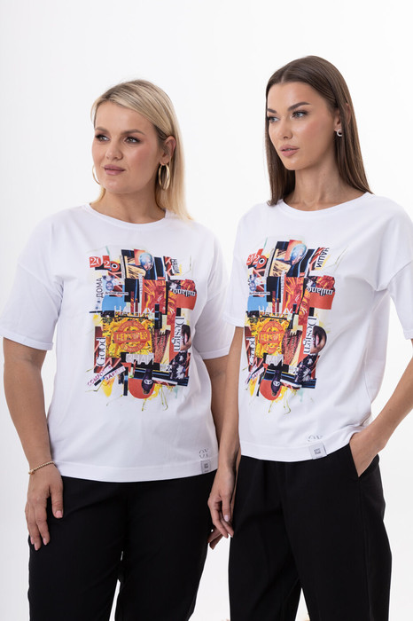 Футболка изготовлена из мягкого хлопка с добавлением эластана, который обеспечивает идеальную посадку, ткань прекрасно дышит и обеспечивает легкость. Нейтральная белая база позволяет принтам оставаться главным акцентом, сочетая футболку с джинсами, юбками, пиджаками или oversize-кардиганами.