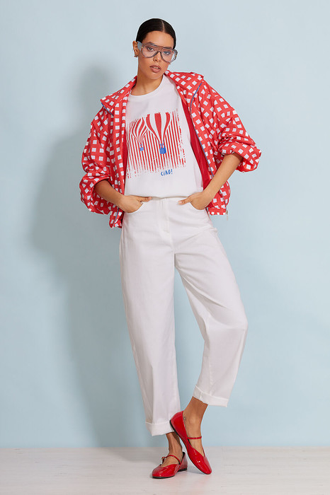 Объемная футболка   оверсайз выполнена из плотного   хлопкового трикотажного полотна (интерлок). Спущенная линия  плеча. Рукав до локтя. Горловина круглая  с притачной планкой.   Дизайнерский         принт “ Воздушный шар”   на  передней  половинке  футболки.