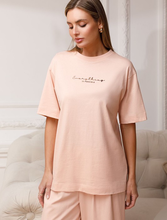 Состав: 100%Хлопок Плотность: 140 Г/м2Оверсайз футболка пудрового цвета выполнена из премиального 100% хлопка плотностью 140 Г/м2. Главная особенность этого изделия — тонкое кулирное полотно, которое легче и воздушнее стандартного варианта. Благодаря своей деликатной текстуре футболка идеально подходит для домашних образов и пижамных комплектов. Ткань отлично дышит, обеспечивая максимальный уют во время сна и отдыха. Особое внимание привлекает стильный принт в виде надписи. Перевод надписи: Everything is possible - Все возможно. Принт выполнен красками с устойчивым покрытием, который добавляет футболке оригинальности и позволяет выразить индивидуальность. Свободный крой футболки дарит удобство и не стесняет движений, что делает ее идеальной для повседневной носки или активного отдыха, подчеркивает современный взгляд на моду. Подойдет девушкам и женщинам на любую фигуру, вы будете чувствовать себя в ней уверенно и комфортно. Отлично впишется в гардероб благодаря универсальному дизайну, который легко сочетать с любыми низами.