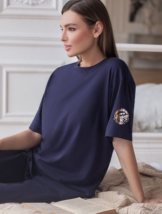 Состав: 100%Хлопок Плотность: 140 Г/м2Оверсайз футболка темно-синего цвета выполнена из премиального 100% хлопка плотностью 140 Г/м2. Главная особенность этого изделия — тонкое кулирное полотно, которое легче и воздушнее стандартного варианта. Благодаря своей деликатной текстуре футболка идеально подходит для домашних образов и пижамных комплектов. Ткань отлично дышит, обеспечивая максимальный уют во время сна и отдыха. Особое внимание привлекает стильный принт в виде надписи на рукаве. Перевод надписи: Sometimes you forget Reminder You re Awesome So tnis is your - Иногда ты забываешь, как ты крута, так что это твое напоминание. Принт выполнен красками с устойчивым покрытием, который добавляет футболке оригинальности и позволяет выразить индивидуальность. Свободный крой футболки дарит удобство и не стесняет движений, что делает ее идеальной для повседневной носки или активного отдыха, подчеркивает современный взгляд на моду. Подойдет девушкам и женщинам на любую фигуру, вы будете чувствовать себя в ней уверенно и комфортно. Отлично впишется в гардероб благодаря универсальному дизайну, который легко сочетать с любыми низами.