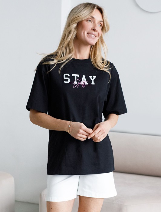 Состав: 100%Хлопок Плотность: 140 Г/м2Оверсайз футболка черного цветавыполнена из премиального 100% хлопка плотностью 140 Г/м2. Главная особенность этого изделия — тонкое кулирное полотно, которое легче и воздушнее стандартного варианта. Благодаря своей деликатной текстуре футболка идеально подходит для домашних образов и пижамных комплектов. Ткань отлично дышит, обеспечивая максимальный уют во время сна и отдыха. Особое внимание привлекает стильный принт в виде надписи. Перевод надписи: Stay Sporty - Оставайся спортивной. Принт выполнен красками с устойчивым покрытием, который добавляет футболке оригинальности и позволяет выразить индивидуальность. Свободный крой футболки дарит удобство и не стесняет движений, что делает ее идеальной для повседневной носки или активного отдыха, подчеркивает современный взгляд на моду. Подойдет девушкам и женщинам на любую фигуру, вы будете чувствовать себя в ней уверенно и комфортно. Отлично впишется в гардероб благодаря универсальному дизайну, который легко сочетать с любыми низами.