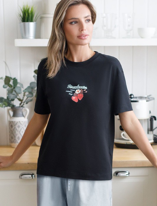 Особое внимание привлекает стильный принт в виде клубники с минималистичной надписью. Перевод надписи: Strawberries sweet summer days - Клубничные сладкие летние дни. Принт выполненны красками с устойчивым покрытием, который добавляет изделию оригинальности и позволяет выразить индивидуальность.