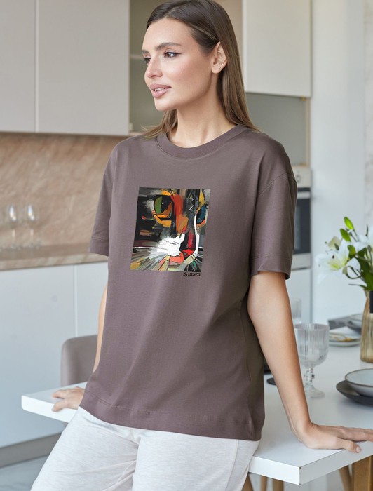 Состав: 100%Хлопок Плотность: 140 Г/м2Футболка кофейного цвета выполнена из премиального 100% хлопка плотностью 140 Г/м2. Главная особенность этого изделия — тонкое кулирное полотно, которое легче и воздушнее стандартного варианта. Благодаря своей деликатной текстуре футболка идеально подходит для домашних образов и пижамных комплектов. Ткань отлично дышит, обеспечивая максимальный уют во время сна и отдыха. Особое внимание привлекает стильный принт контрастного яркого цвета в виде кота. Принт выполнен красками с устойчивым покрытием, который добавляет изделию оригинальности и позволяет выразить индивидуальность. Свободный крой футболки дарит удобство и не стесняет движений, что делает ее идеальной для повседневной носки или активного отдыха, подчеркивает современный взгляд на моду. Подойдет девушкам и женщинам на любую фигуру, вы будете чувствовать себя в ней уверенно и комфортно. Лаконичный современный принт делает изделие универсальным: можно создавать стильные образы для прогулок, встреч, занятий спортом и домашних дел. Базовая футболка подходит для любой ситуации и сочетается с разными элементами гардероба.