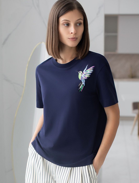Состав: 100%Хлопок Плотность: 140 Г/м2Футболка темно-синего цветавыполнена из премиального 100% хлопка плотностью 140 Г/м2. Главная особенность этого изделия — тонкое кулирное полотно, которое легче и воздушнее стандартного варианта. Благодаря своей деликатной текстуре футболка идеально подходит для домашних образов и пижамных комплектов. Ткань отлично дышит, обеспечивая максимальный уют во время сна и отдыха. Особое внимание привлекает стильный принт контрастного цвета в виде колибри. Принт выполнен красками с устойчивым покрытием, который добавляет изделию оригинальности и позволяет выразить индивидуальность. Свободный крой футболки дарит удобство и не стесняет движений, что делает ее идеальной для повседневной носки или активного отдыха, подчеркивает современный взгляд на моду. Подойдет девушкам и женщинам на любую фигуру, вы будете чувствовать себя в ней уверенно и комфортно. Лаконичный современный принт делает изделие универсальным: можно создавать стильные образы для прогулок, встреч, занятий спортом и домашних дел. Базовая футболка подходит для любой ситуации и сочетается с разными элементами гардероба.