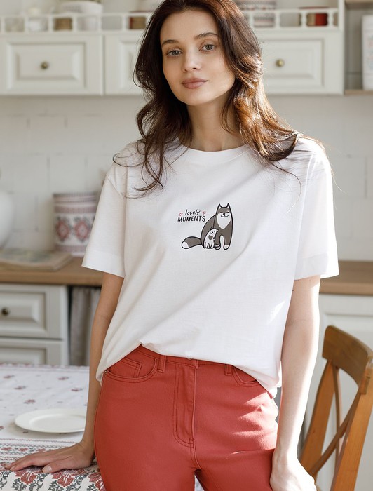 Состав: 100%Хлопок Плотность: 140 Г/м2Футболка белого цвета выполнена из премиального 100% хлопка плотностью 140 Г/м2. Главная особенность этого изделия — тонкое кулирное полотно, которое легче и воздушнее стандартного варианта. Благодаря своей деликатной текстуре футболка идеально подходит для домашних образов и пижамных комплектов. Ткань отлично дышит, обеспечивая максимальный уют во время сна и отдыха. Особое внимание привлекает стильный принт контрастного цвета в виде котиков с надписью. Перевод надписи: Love moments - Моменты любви. Принт выполнен красками с устойчивым покрытием, который добавляет изделию оригинальности и позволяет выразить индивидуальность. Свободный крой футболки дарит удобство и не стесняет движений, что делает ее идеальной для повседневной носки или активного отдыха, подчеркивает современный взгляд на моду. Подойдет девушкам и женщинам на любую фигуру, вы будете чувствовать себя в ней уверенно и комфортно. Лаконичный современный принт делает изделие универсальным: можно создавать стильные образы для прогулок, встреч, занятий спортом и домашних дел. Базовая футболка подходит для любой ситуации и сочетается с разными элементами гардероба.
