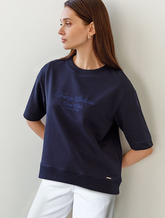Состав: 95%Хлопок 5%ПУ Плотность: 240 Г/м2 Параметры модели на первом фото: Рост 172, бюст 88, талия 64, бедра 88 Размер товара на первом фото: 42Футболка темно-синего цвета свободного кроя выполнена из премиального футера двухнитки с эластаном плотностью 240 Г/м2. . Натуральный материал отличается мягкостью и приятной текстурой, позволяя коже дышать и обеспечивая максимальное удобство при носке. Наличие эластана в составе изделия гарантирует абсолютный комфорт и формоустойчивость. Круглый ворот, рукава средней длины и спущенная линия плеча придают футболке стильный и современный вид, делают образ расслабленным и непринужденным, такой вариант отлично сядет на большие размеры. Футболку украшает принт виде надписи. Перевод надписи: Vintage collection - Витнажная коллекция. Плотная футболка идеально подходит для повседневной носки и незаменима для тех, кто ценит удобство и свободу движений без компромиссов по стилю.