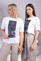 Футболка женская из гладкокрашенного трикотажного полотна «кулирка», свободного силуэта, с боковыми швами, переходящими в рельефы, в правом соединительном шве выполнен разрез. Горловина овальной формы обработана втачной планкой и дополнена декоративным элементом.