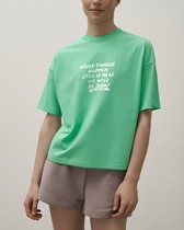 Футболка слегка полуприлегающего силуэта длиной до бедер. Короткий рукав. Круглая горловина обработана узкой притачной обтачкой из основного полотна. По горловине отстрочка. По ростку проложен усилитель из экстрафорной ленты. С изнаночной стороны спинки выполнена печать-размерник. На полочке выполнена шелкография и вышивка прозрачными пайетками.