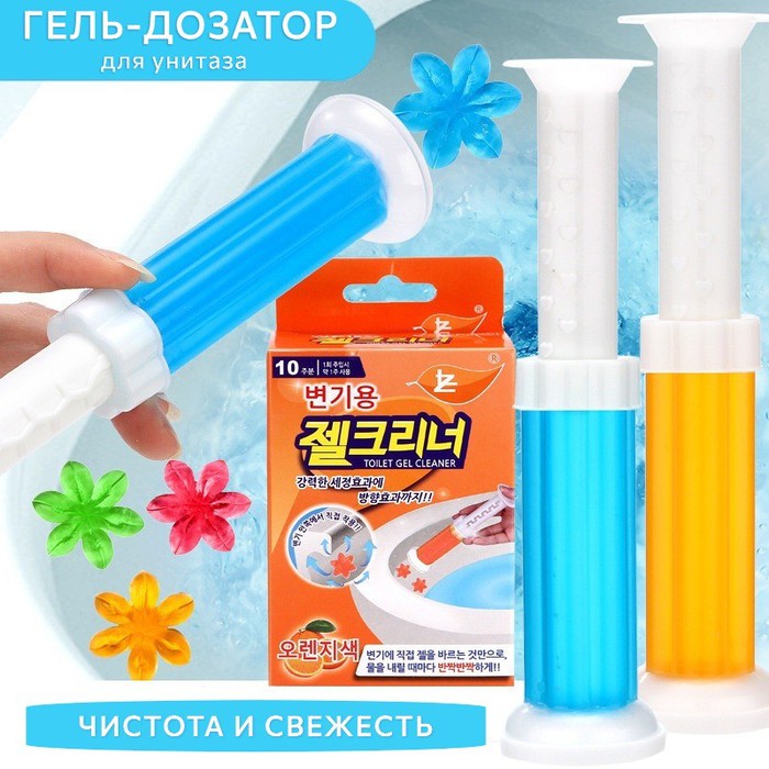 Антибактериальный очиститель гель-дозатор в форме цветочков - это удобное и эффективное средство для поддержания чистоты и свежести унитаза., В 1 шприце 14 порций.Гель легко выдавливается из шприца и закрепляется, можно использовать как для унитазов, так и для писуаров.Порция геля в шприце достаточна для нескольких недель использования, что делает этот набор экономичным вариантом., Аромат не навязчивый, приятный и свежий сильнее в начале и более слабый по мере смывания цветочка. Для более сильного аромата можно использовать 2-3 цветочка одновременно., Активное вещество эффективно очищает поверхность под ободком и в самых труднодоступных местах от желтого налета, ржавчины, препятствует образованию известковых отложений и мочевого камня., Способ применения:1. Вставьте поршень в тубу.2. Снимите колпачок с тубы.3. Нанесите средство на чистую сухую поверхность унитаза в зоне омываемой водой нажатием на поршень до щелчка. Сильно давить не нужно! Достаточно не сильного нажатия . Диск плотно прилипнет к поверхности.