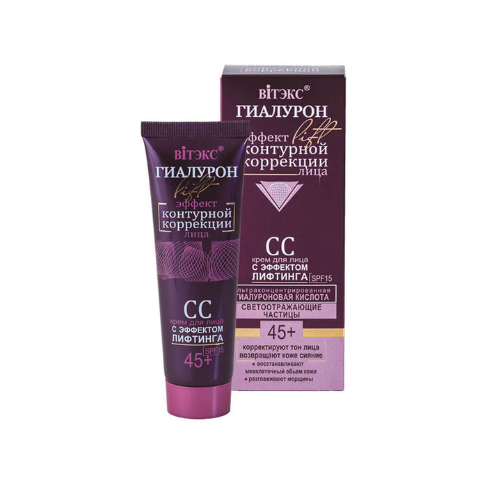 Ультраконцентрированная гиалуроновая кислота Светоотражающие частицы • корректируют тон лица • возвращают коже сияние • восстанавливают межклеточный объем кожи • разглаживают морщины СС крем для лица с эффектом лифтинга — многофункциональное средство, которое мгновенно корректирует цвет лица и подтягивает кожу, разглаживая мелкие и глубокие морщины. Активные компоненты: ультраконцентрированная гиалуроновая кислота, светоотражающие частицы, peptide-комплекс Renaissance®, солнцезащитный фактор SPF15.